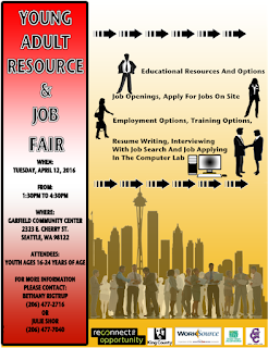 The WorkSource Business Services Team is working closely with Garfield Community Center, King County, Seattle Parks & Recreation, Reconnect to Opportunity and ARC to bring to you the Young Adult Resource & Job Fair on 4/12/2016 from 1:30pm to 4:30pm at the Garfield Community Center as well as the Job Fair & Job Readiness Workshop for Young Adults on 4/11/2016. There are over 50 participating organization at this MASSIVE event! Please help us get the word out!